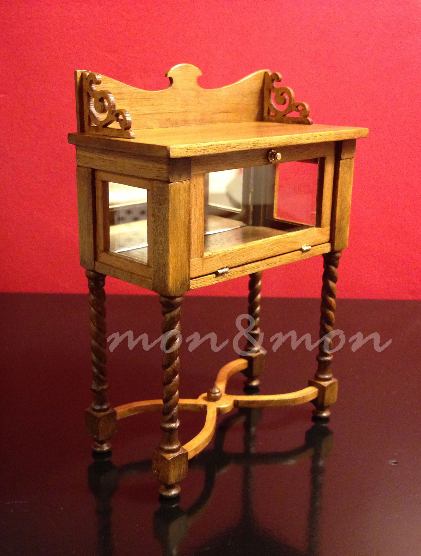 Vitrina con espejo en madera de nogal y patas torneadas a mano